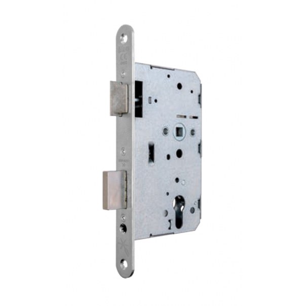 Zamek przeciwpożarowy o rozstawie 72 mm i głębokości 55 mm. Wyposażony w otwór na wkładkę bębenkową i dwuskokowy rygiel wysuwany na 20 mm. Odpowiedni do zastosowania w drzwiach metalowych.