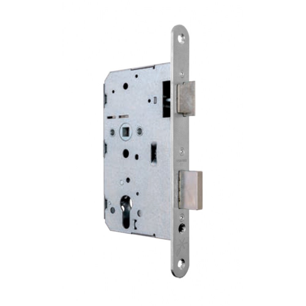 Zamek przeciwpożarowy o rozstawie 72 mm i głębokości 65 mm. Wyposażony w otwór na wkładkę bębenkową i dwuskokowy rygiel wysuwany na 20 mm. Odpowiedni do zastosowania w drzwiach metalowych.