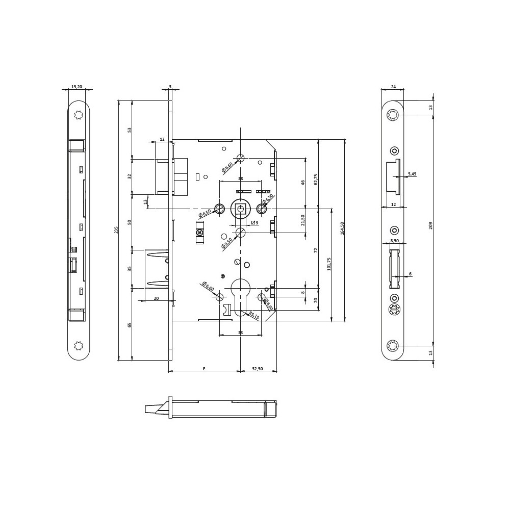 Zamek z funkcją paniczną E do jednoskrzydłowych drzwi przeciwpożarowych, znajdujących się na drogach ewakuacyjnych. Posiada rozstaw 72 mm, głębokość (dormas) 65 mm, otwór na wkładkę bębenkową o profilu europejskim oraz otwór na trzpień ⧄ 9 mm. Jest także wyposażony w ocynkowaną stalową blachę czołową o wymiarach 235x24x3 mm, dostępną w wykończeniu galwanizowanym na biało.