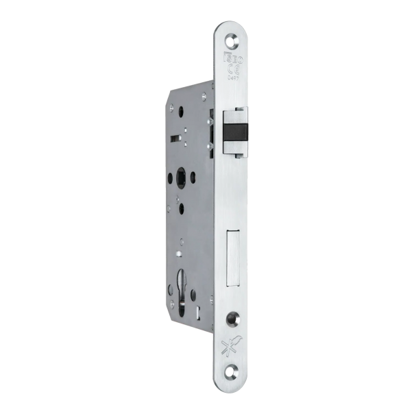 Zamek przeciwpożarowy z cicho pracującym zaczepem. Wyposażony w blachę czołową ze stali nierdzewnej i dwuskokowy rygiel wysuwany na 20 mm.