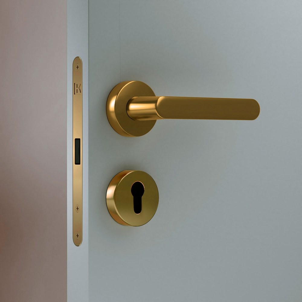 Zamek magnetyczny o rozstawie 85 mm i głębokości 50 mm. Posiada otwór na wkładkę bębenkową o profilu europejskim i jest dostarczany wraz z blachą czołową w wykończeniu pozłacanym matowym.