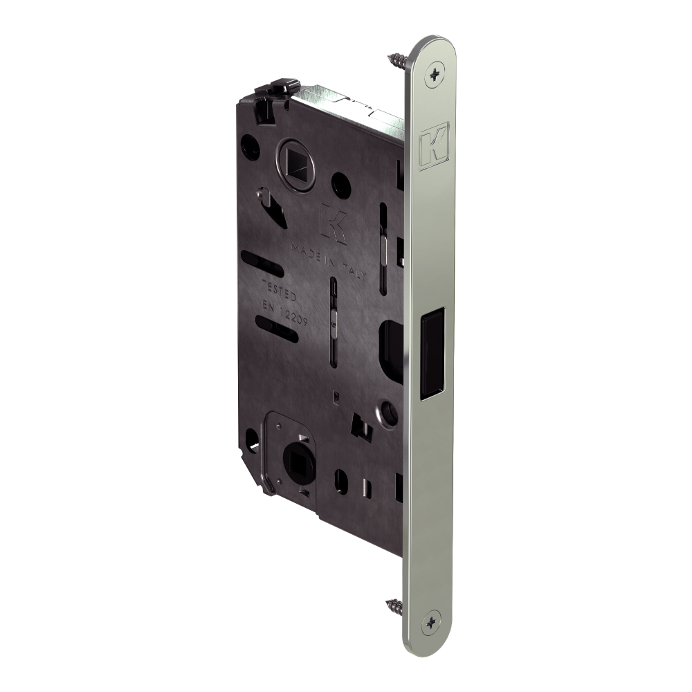 Zamek jest dostarczany wraz z blachą czołową i wkrętami montażowymi. Symetryczny zaczep umożliwia zastosowanie zamka zarówno na lewych, jak i prawych skrzydłach drzwiowych. Zaczep pozostaje schowany przy otwartych drzwiach, nie wymaga smarowania ani dodatkowych prac konserwacyjnych. Konstrukcja zamka sprawia, że zaczep nie uderza o ościeżnicę, dzięki czemu zamek zachowuje swój wygląd i funkcjonalność przez długi czas bez widocznych oznak eksploatacji.