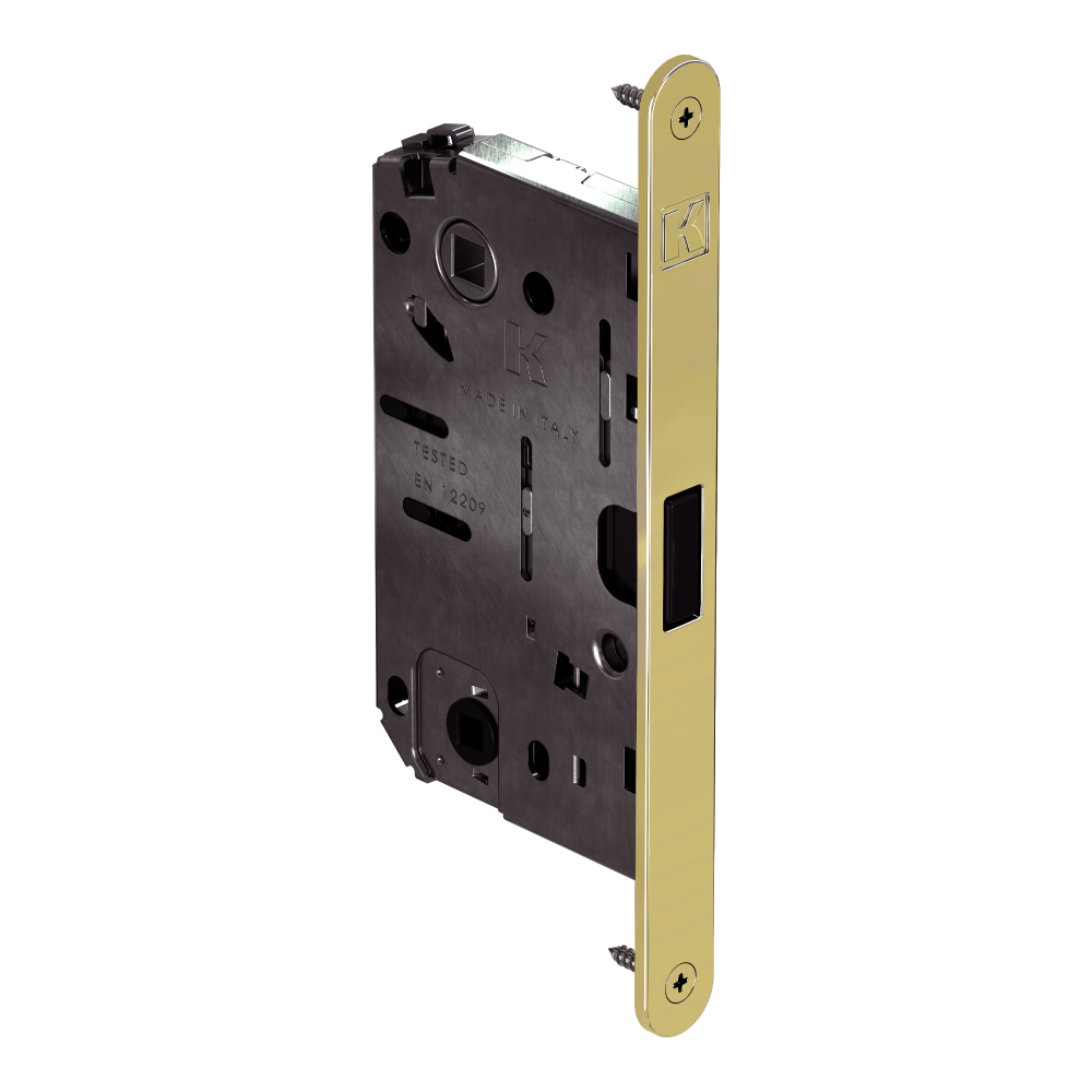 Zamek magnetyczny o rozstawie 96 mm i głębokości 50 mm. Posiada otwór na blokadę WC. Jest wyposażony w blachę czołową w wykończeniu pozłacanym matowym.