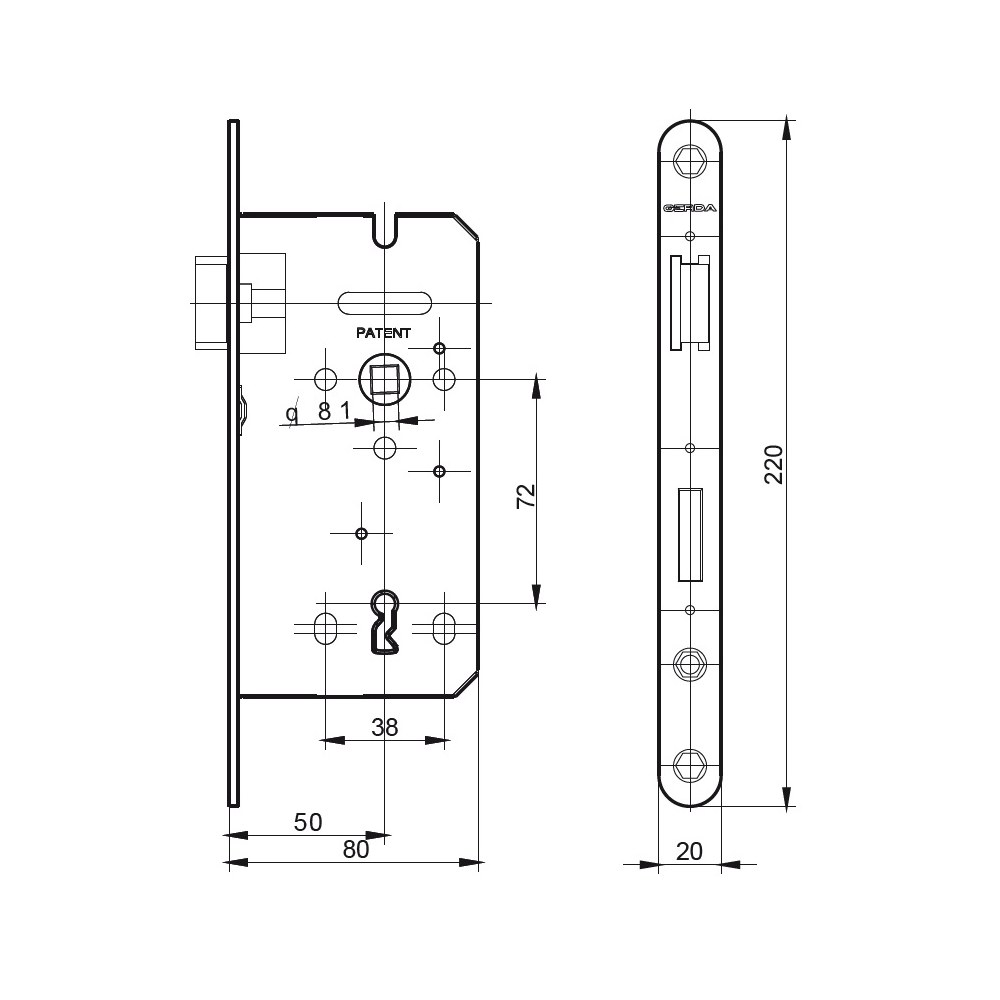 Prezentowany wariant zamka posiada rozstaw 72 mm, a jego głębokość (dormas) wynosi 50 mm. Mechanizm zamka znajduje się w kasecie o grubości 13 mm. Z kolei blacha czołowa posiada wymiary 220x20x3 mm i występuje w wykończeniu galwanizowanym na żółto. Wysoka jakość poszczególnych elementów oraz konstrukcja zamka gwarantuje jego wieloletnią bezproblemową pracę.