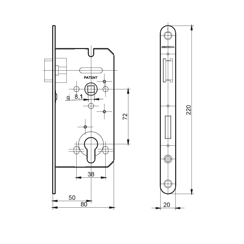 Prezentowany wariant zamka posiada rozstaw 72 mm, a jego głębokość (dormas) wynosi 50 mm. Mechanizm zamka znajduje się w kasecie o grubości 13 mm. Z kolei blacha czołowa posiada wymiary 220x20x3 mm i występuje w wykończeniu galwanizowanym na żółto. Wysoka jakość poszczególnych elementów oraz konstrukcja zamka gwarantuje jego wieloletnią bezproblemową pracę.
