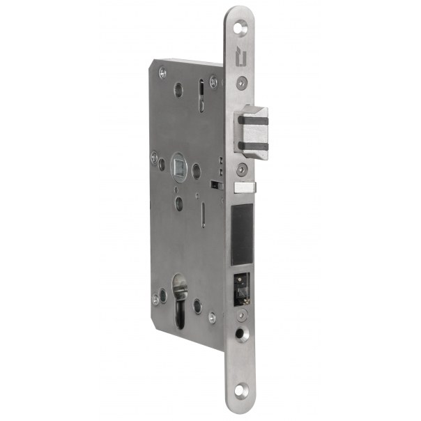 Zamek do drzwi zewnętrznych DIN R wyposażony w blachę czołową ze stali nierdzewnej o wymiarach 235x20x3 mm. Posiada rozstaw 72 mm, a jego głębokość wynosi 65 mm. Został również wyposażony w otwór na wkładkę bębenkową. Do zamka należy dokupić odpowiednią blachę zaczepową z modułem nadajnika.