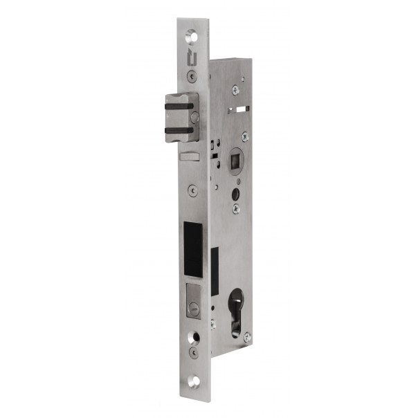 Zamek do drzwi profilowych DIN L wyposażony w blachę czołową ze stali nierdzewnej o wymiarach 245x24x3 mm. Posiada rozstaw 92 mm, a jego głębokość wynosi 35 mm. Został również wyposażony w otwór na wkładkę bębenkową. Do zamka należy dokupić odpowiednią blachę zaczepową z modułem nadajnika.