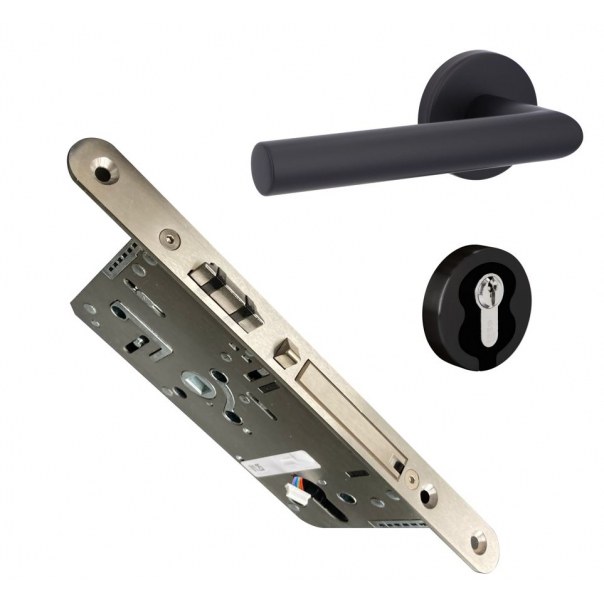 Zamek do drzwi jest dostarczany wraz z komorą na baterie zawierającą 2 baterie litowe AAA L92, osłoną komory na baterie, szyldem WB z czytnikiem RFID oraz instrukcją montażu. W zestawie znajduje się także klamka Ronny dostępna w wykończeniu lakierowanym na czarno i dedykowana do drzwi o grubości 39-47 mm.
