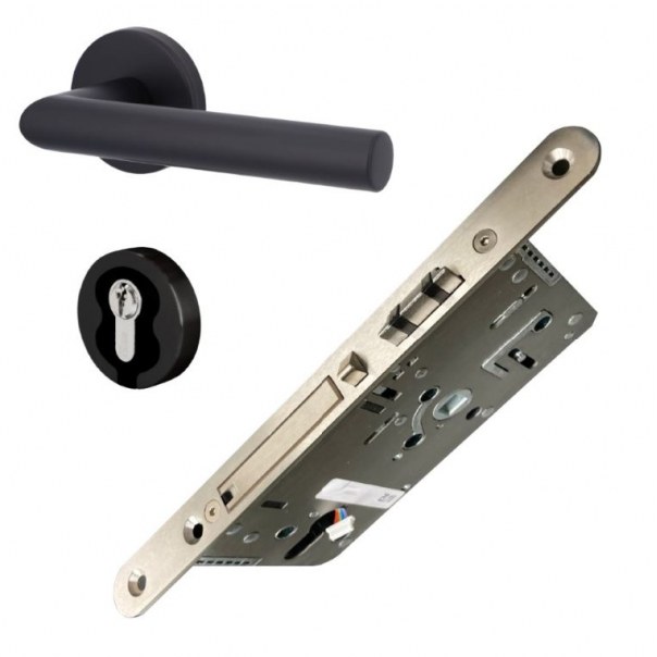 Zamek do drzwi jest dostarczany wraz z komorą na baterie zawierającą 2 baterie litowe AAA L92, osłoną komory na baterie, szyldem WB z czytnikiem RFID oraz instrukcją montażu. W zestawie znajduje się także klamka Ronny w wykończeniu lakierowanym na czarno, dedykowana do drzwi o grubości 39-47 mm.