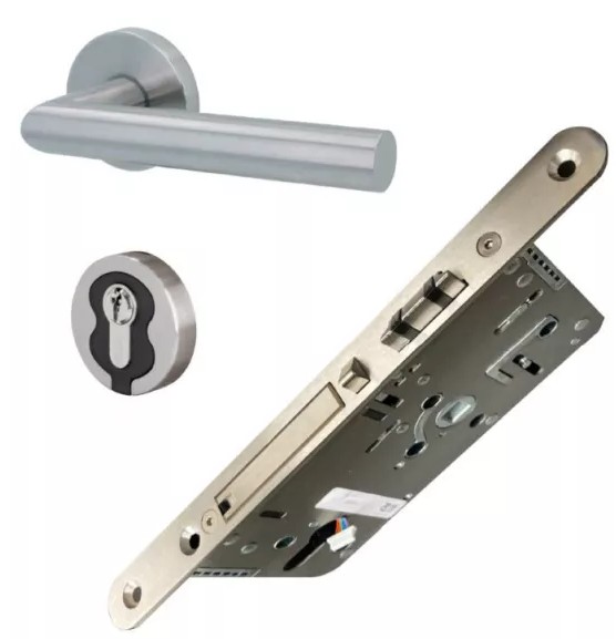 Zamek do drzwi, komora z 2 bateriami litowymi AAA L92, osłona komory na baterie, szyld WB z czytnikiem RFID oraz instrukcja montażu. W zestawie znajduje się także wykonana ze stali nierdzewnej klamka Ronny, dedykowana do drzwi o grubości 39-47 mm.