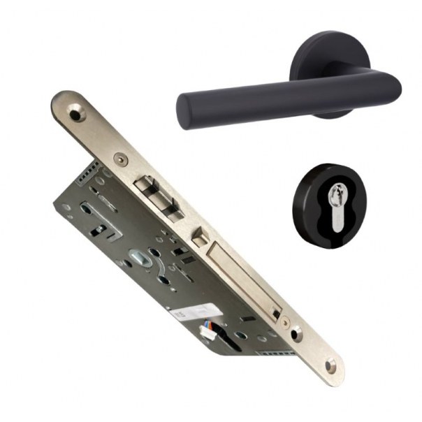 Zamek do drzwi jest dostarczany wraz z komorą na baterie zawierającą 2 baterie litowe AAA L92, osłoną komory na baterie, szyldem WB z czytnikiem RFID oraz instrukcją montażu. W zestawie znajduje się także klamka Ronny w wykończeniu lakierowanym na czarno, dedykowana do drzwi o grubości 39-47 mm.