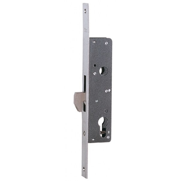 Zamek wpuszczany jednopunktowy na wkładkę bębenkową, przeznaczony do drzwi profilowych aluminiowych. Posiada rozstaw 85 mm i głębokość (dormas) 35 mm. Dostarczany wraz z płaską blachą czołową o wymiarach 290x24x3 mm, wykonaną ze stali nierdzewnej matowej. Wyposażony w rygiel hakowy, który wysuwa się na 18 mm. Prześwit pod hakiem wynosi 8 mm.