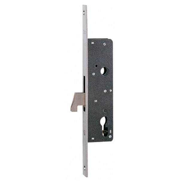 Zamek wpuszczany jednopunktowy na wkładkę bębenkową, przeznaczony do drzwi profilowych aluminiowych. Posiada rozstaw 85 mm i głębokość (dormas) 35 mm. Dostarczany wraz z płaską blachą czołową o wymiarach 290x24x3 mm, wykonaną ze stali nierdzewnej matowej. Wyposażony w rygiel hakowy, który wysuwa się na 18 mm. Prześwit pod hakiem wynosi 8 mm.