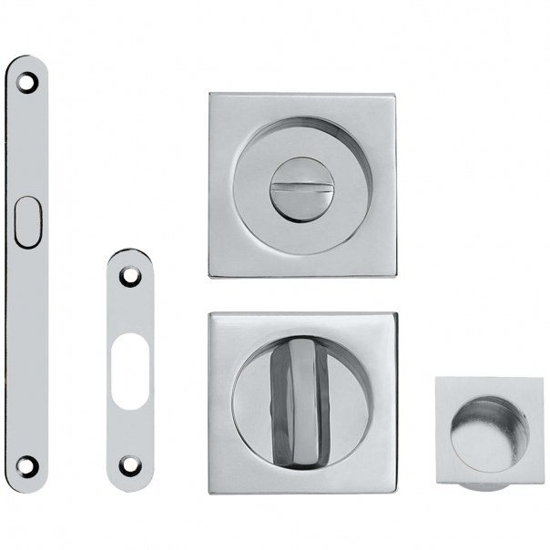 Zamek hakowy z kwadratową blokadą WC dedykowany do zastosowania w drewnianych drzwiach przesuwnych. Wykonany z mosiądzu i dostępny w wykończeniu chromowanym.
