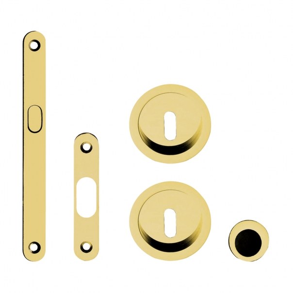 Zamek hakowy z okrągłymi okuciami i otworem na klucz. Dedykowany do montażu w drewnianych drzwiach przesuwnych. Wykonany z mosiądzu i dostępny w wykończeniu lakierowanym.