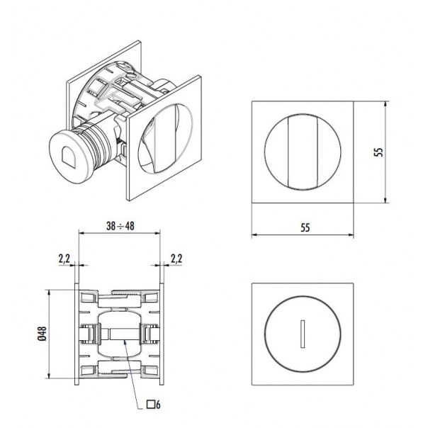 Kwadratowy zamek hakowy z blokadą WC. Dedykowany do zastosowania w drewnianych drzwiach przesuwnych o grubości skrzydła od 38 do 48 mm. Dostępny w wykończeniu chromowanym matowym. Głębokość (dormas) zamka wynosi 50 mm.