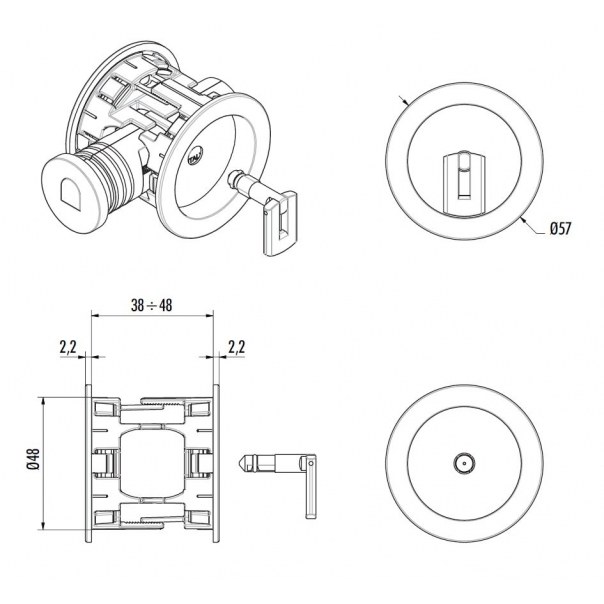 Okrągły zamek hakowy z blokadą WC. Dedykowany do zastosowania w drewnianych drzwiach przesuwnych o grubości skrzydła od 38 do 48 mm. Dostępny w wykończeniu brązowionym. Głębokość (dormas) zamka wynosi 50 mm.