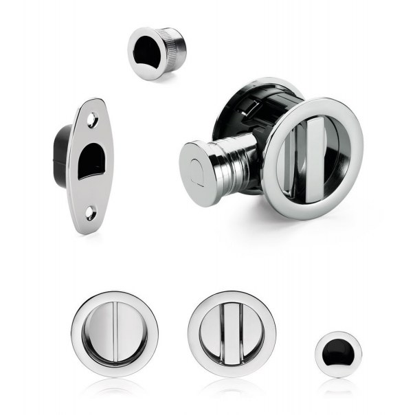Okrągły zamek hakowy z blokadą WC. Dedykowany do zastosowania w drewnianych drzwiach przesuwnych o grubości skrzydła od 38 do 48 mm. Dostępny w wykończeniu chromowanym. Głębokość (dormas) zamka wynosi 50 mm.