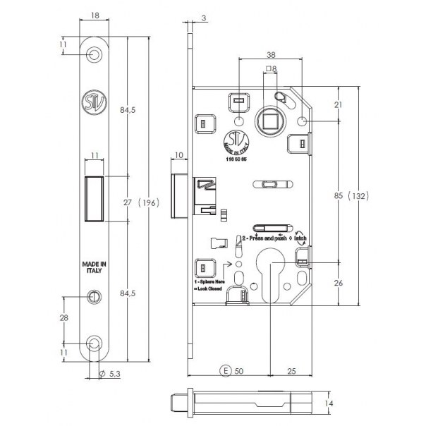 Zamek jest dostarczany wraz z wykonaną ze stali płaską blachą czołową o wymiarach 196x18x3 mm w wykończeniu niklowanym matowym. Produkcja zamka odbywa się w nowoczesnych zakładach zlokalizowanych na terenie Unii Europejskiej, co gwarantuje wysoką jakość wykonania i niezawodne działanie.