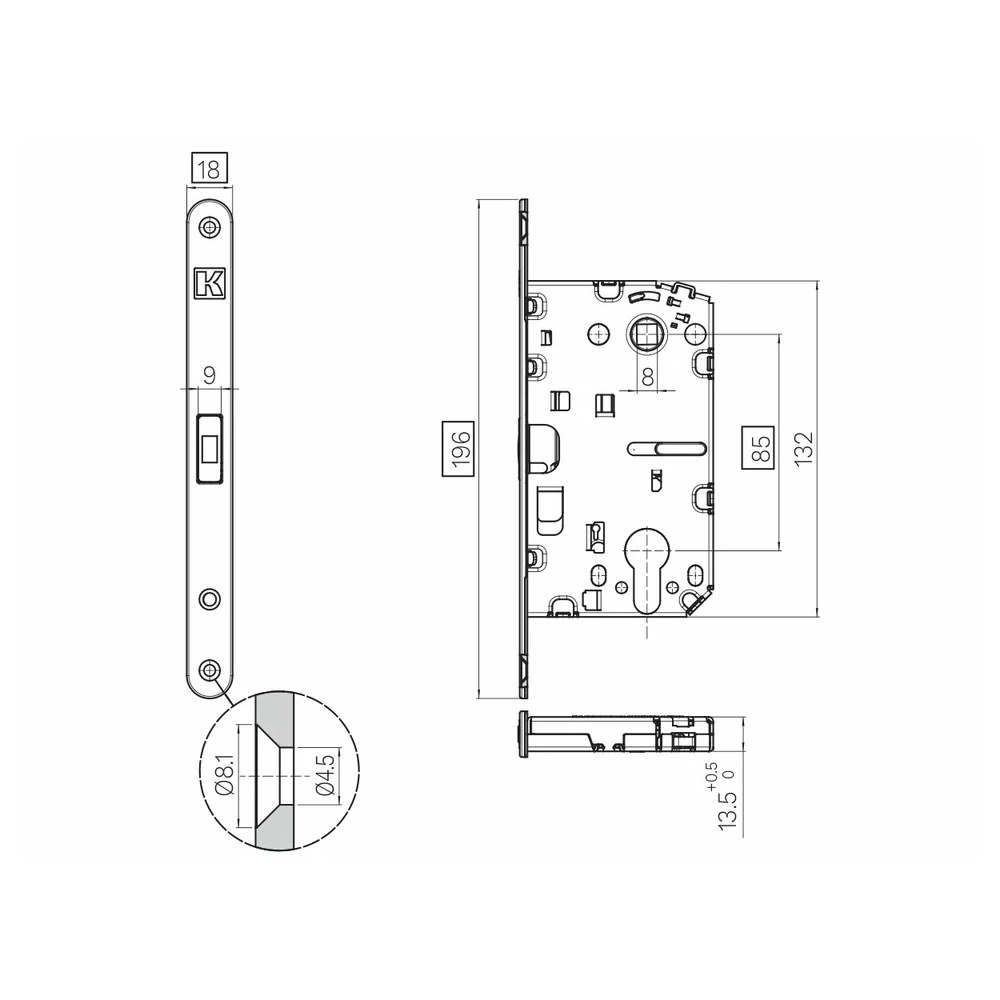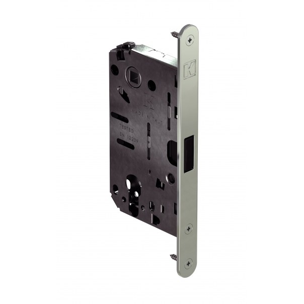 Zamek jest dostarczany wraz z blachą czołową, dwoma wkrętami montażowymi oraz wkrętem dedykowanym do zainstalowania wkładki. Symetryczny zaczep umożliwia zastosowanie zamka zarówno na lewych, jak i prawych skrzydłach drzwiowych.