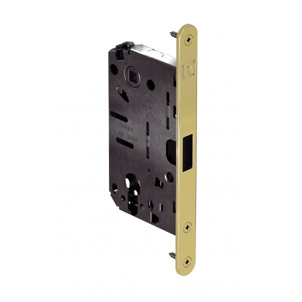 Zamek jest dostarczany wraz z blachą czołową, dwoma wkrętami montażowymi oraz wkrętem dedykowanym do zainstalowania wkładki. Symetryczny zaczep umożliwia zastosowanie zamka zarówno na lewych, jak i prawych skrzydłach drzwiowych.