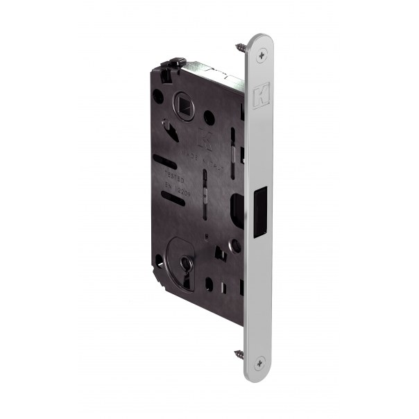 Zamek jest dostarczany wraz z blachą czołową i wkrętami montażowymi. Symetryczny zaczep umożliwia zastosowanie zamka zarówno na lewych, jak i prawych skrzydłach drzwiowych. Zaczep pozostaje schowany przy otwartych drzwiach, nie wymaga smarowania ani dodatkowych prac konserwacyjnych. Konstrukcja zamka sprawia, że zaczep nie uderza o ościeżnicę, dzięki czemu zamek zachowuje swój wygląd i funkcjonalność przez długi czas bez widocznych oznak eksploatacji.
