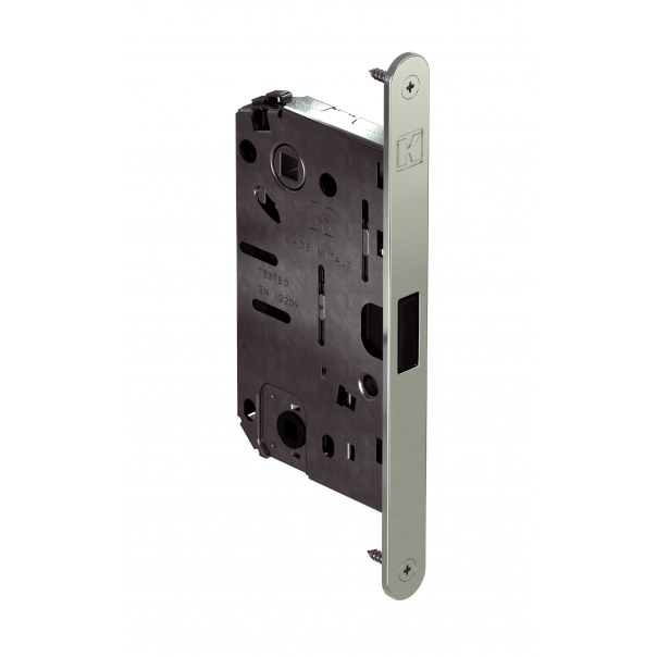 Zamek jest dostarczany wraz z blachą czołową i wkrętami montażowymi. Symetryczny zaczep umożliwia zastosowanie zamka zarówno na lewych, jak i prawych skrzydłach drzwiowych. Zaczep pozostaje schowany przy otwartych drzwiach, nie wymaga smarowania ani dodatkowych prac konserwacyjnych. Konstrukcja zamka sprawia, że zaczep nie uderza o ościeżnicę, dzięki czemu zamek zachowuje swój wygląd i funkcjonalność przez długi czas bez widocznych oznak eksploatacji.