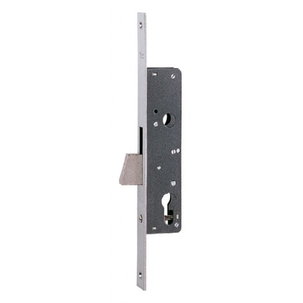 Zamek wpuszczany jednopunktowy na wkładkę bębenkową, przeznaczony do drzwi profilowych aluminiowych. Posiada rozstaw 85 mm, a jego głębokość (tzw. dormas) wynosi 25 mm. Dostarczany wraz z płaską blachą czołową o wymiarach 290x24x3 mm, wykonaną ze stali nierdzewej w wykończeniu matowym. Wyposażony w rygiel obrotowy, który wysuwa się na 24 mm.