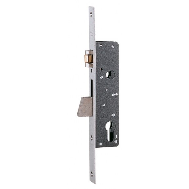 Zamek wpuszczany jednopunktowy na wkładkę bębenkową, przeznaczony do drzwi profilowych aluminiowych. Posiada rozstaw 85 mm i głębokość (dormas) 25 mm. Dostarczany wraz z płaską blachą czołową o wymiarach 290x24x3 mm, wykonaną ze stali nierdzewnej i dostępną w wykończeniu matowym. Wyposażony w rolkę i rygiel obrotowy wysuwany na 24 mm.