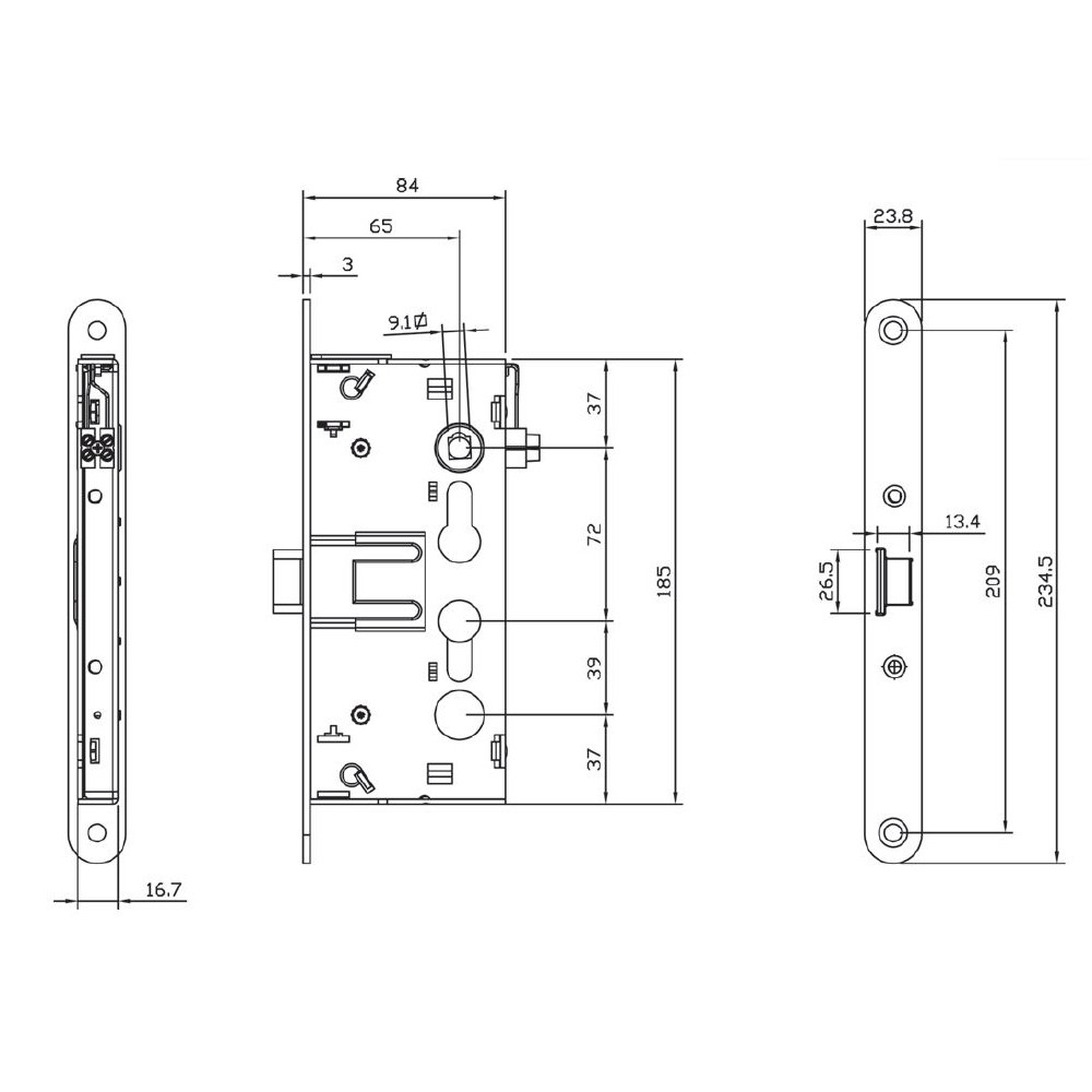 Posiada blachę czołową płaską ze stali galwanizowanej na biało oraz otwór na trzpień ⧄ 9 mm. Rozstaw zamka wynosi 72 mm, a głębokość (dormas) 65 mm. Zamek otwierany jest do wewnątrz.