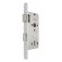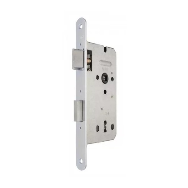 Zamek wpuszczany z otworem na klucz oraz blachą czołową w wykończeniu galwanizowanym na biało. Dedykowany do zastosowania w drzwiach drewnianych.