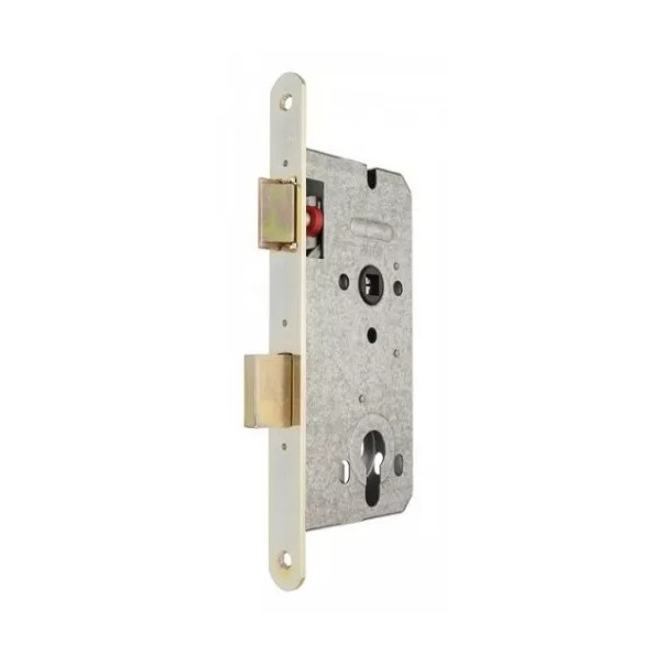 Zamek wpuszczany z otworem na wkładkę bębenkową o profilu europejskim oraz blachą czołową w wykończeniu galwanizowanym na żółto. Dedykowany do zastosowania w drzwiach drewnianych.