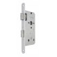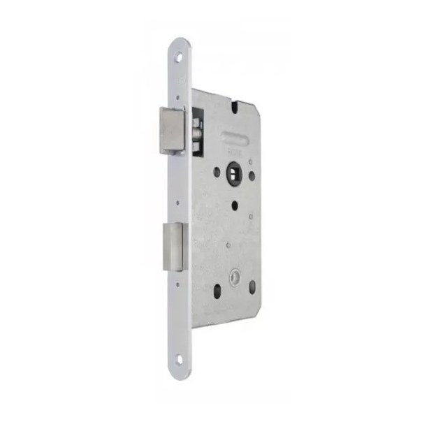 Zamek wpuszczany z blokadą WC oraz blachą czołową w wykończeniu galwanizowanym na biało. Dedykowany do zastosowania w drzwiach drewnianych znajdujących się w łazienkach i toaletach.