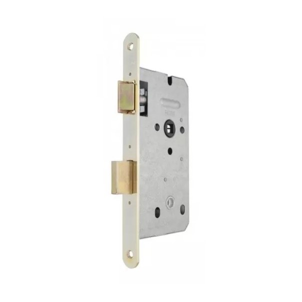 Zamek wpuszczany z blokadą WC oraz blachą czołową w wykończeniu galwanizowanym na żółto. Dedykowany do zastosowania w drzwiach drewnianych znajdujących się w łazienkach i toaletach.