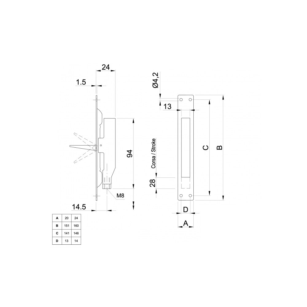 Zasuwa czołowa o wymiarach 151x20 mm. Dedykowana do drzwi metalowych / profilowych.