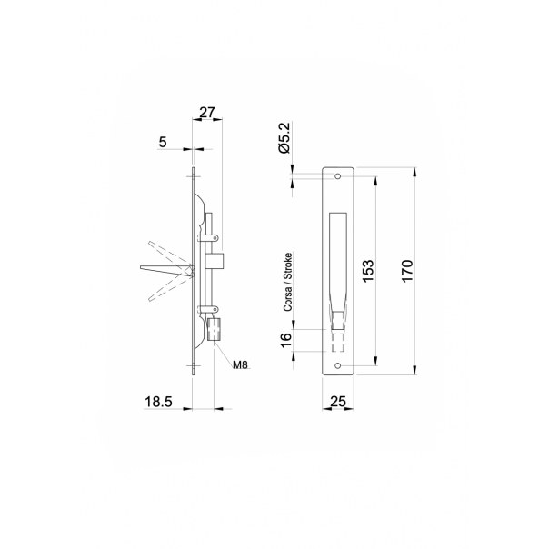 Zasuwa czołowa uruchamiana ręcznie za pomocą dźwigni i odpowiednia do zastosowania w drzwiach metalowych i profilowych.