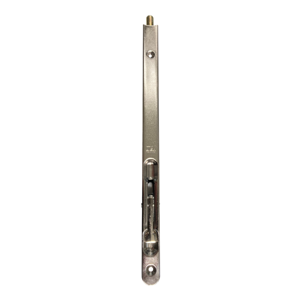 Zaokrąglona zasuwa czołowa o długości 200 mm. Wykonana ze stali i dedykowana do zastosowania w drzwiach drewnianych.