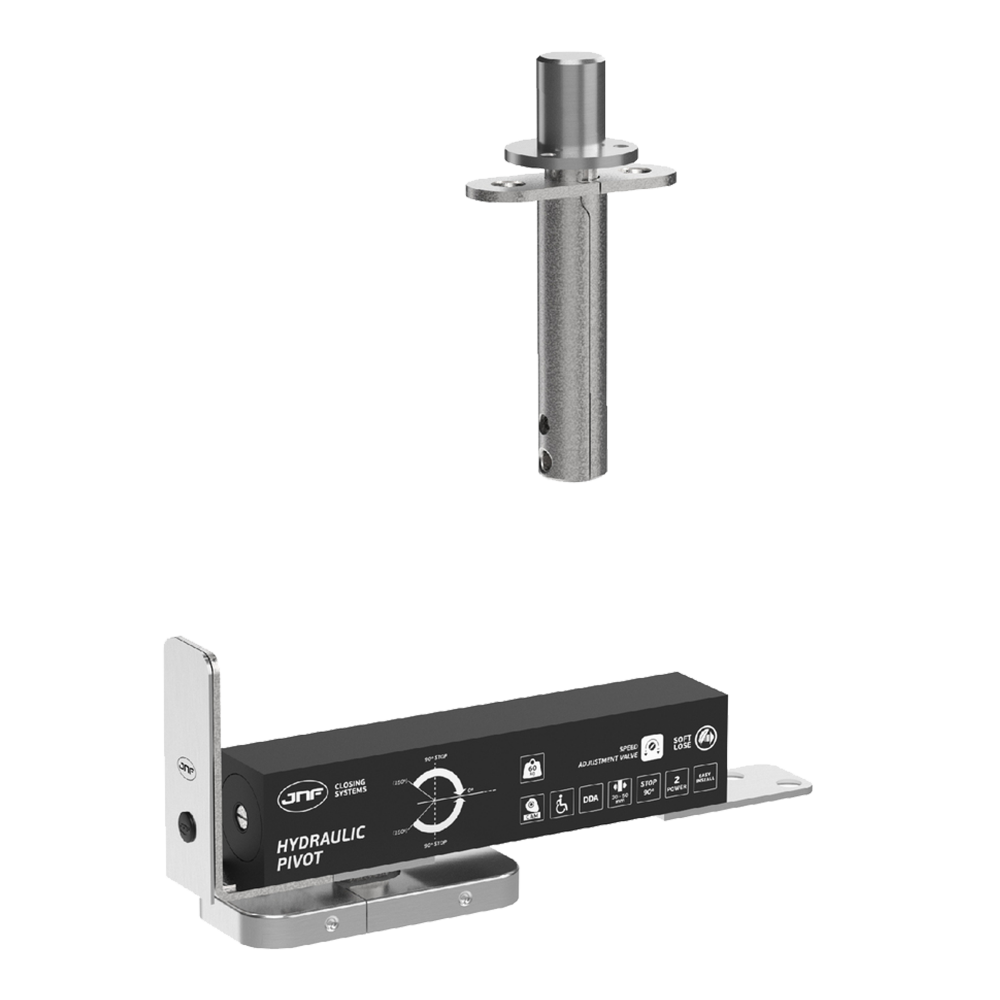 Zawias hydrauliczny do drzwi typu pivot o maksymalnej wadze 60 kg i szerokości do 850 mm. Wykonany ze stali nierdzewnej AISI 304. Posiada regulację siły zamykania za pomocą śruby oraz oferuje mechanizm Soft Close, zapewniający łagodne domykanie skrzydła.