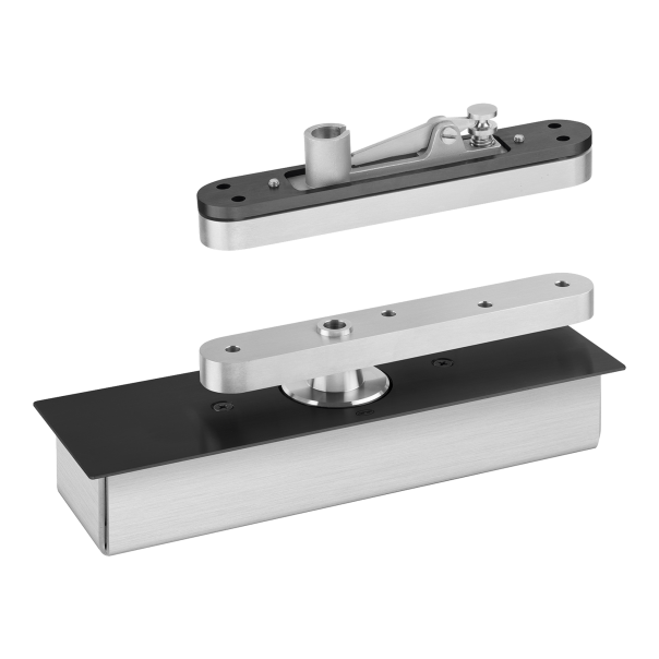 Stalowy zawias do drzwi drewnianych typu pivot o maksymalnej wadze 500 kg, grubości skrzydła minimum 40 mm i maksymalnej szerokości 3000 mm. Kąt obrotu zawiasu wynosi pełne 360° co oznacza, że korzystając z niego można uzyskać drzwi obrotowe.