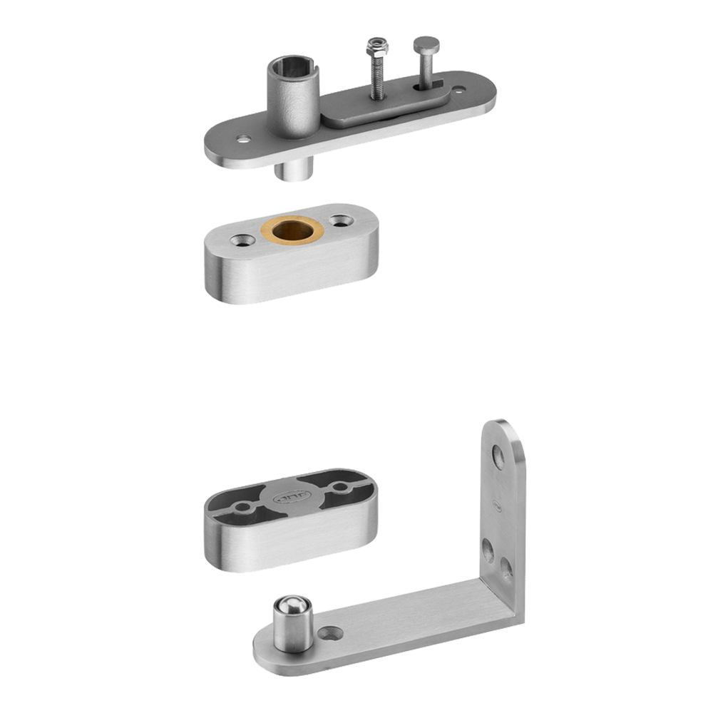 Zawias składający się z części górnej i części dolnej. Dedykowany do drzwi drewnianych typu pivot o maksymalnej wadze 100 kg i minimalnej grubości skrzydła 35 mm. Wykonany ze stali nierdzewnej i dostępny w wykończeniu matowym.