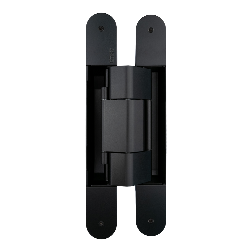 Zawias wpuszczany z regulacją 3D. Jest dedykowany do drewnianych drzwi bezprzylgowych zamontowanych na ościeżnicy drewnianej / aluminiowej. Siedem osi obrotu powoduje zmniejszone tarcie, płynny ruch ramion zawiasu oraz wpływa korzystnie na jego trwałość i nośność. Zawias jest dostarczany wraz z czterema dedykowanymi nasadkami i wkrętami montażowymi. Występuje w wykończeniu lakierowanym na czarno.