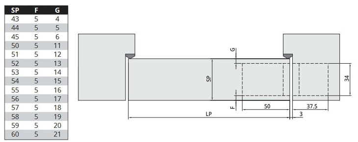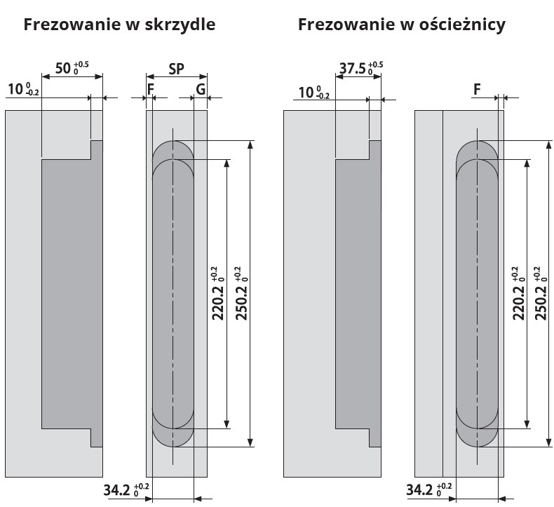 Poniższe grafiki prezentują prawidłowe wymiary frezowania w skrzydle i ościeznicy. Minimalna głębokość frezowania w ościeżnicy, niezbędna do prawidłowego zamontowania zawiasów wynosi 37,5 mm, a głębokość frezowania w skrzydle 50 mm.