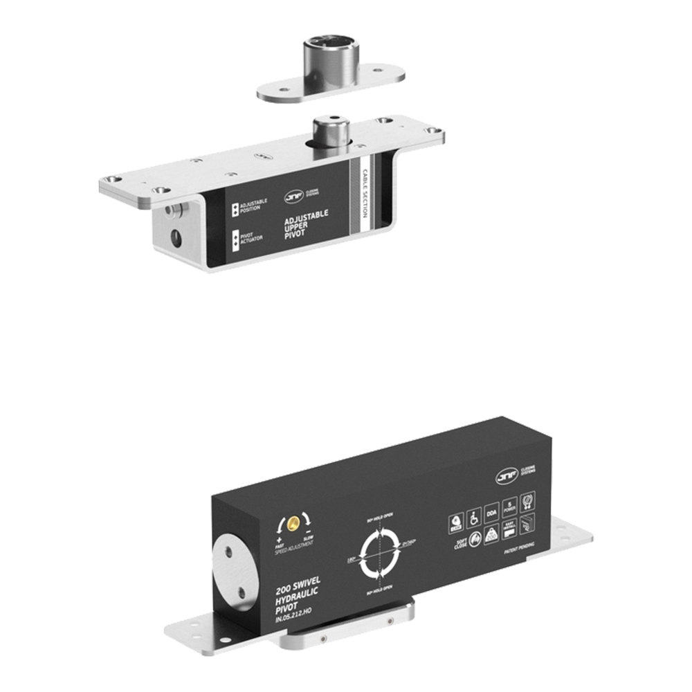 Zawias hydrauliczny do drzwi typu pivot składający się z części górnej oraz z części dolnej. Wykonany ze stali nierdzewnej AISI 304 i dedykowany do montażu w drzwiach drewnianych o maksymalnej wadze 200 kg. Wyposażony w zawór do regulacji szybkości zamykania i siły domykania skrzydła, system Soft Close, a także funkcję przytrzymania otwarcia przy położeniu skrzydła 90°.