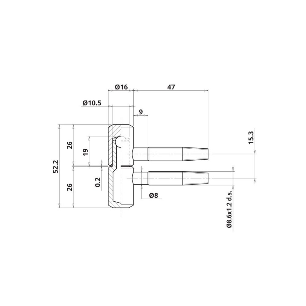 Górna część zawiasu OT 055 o średnicy 16 mm wyposażona w jeden trzpień o długości 47 mm. Dedykowana do zastosowania wraz z dolną częścią na drewnianych drzwiach przylgowych. Odpowiednia do drzwi o maksymalnej wadze 60 kg. Posiada wykończenie BN - brązowione.