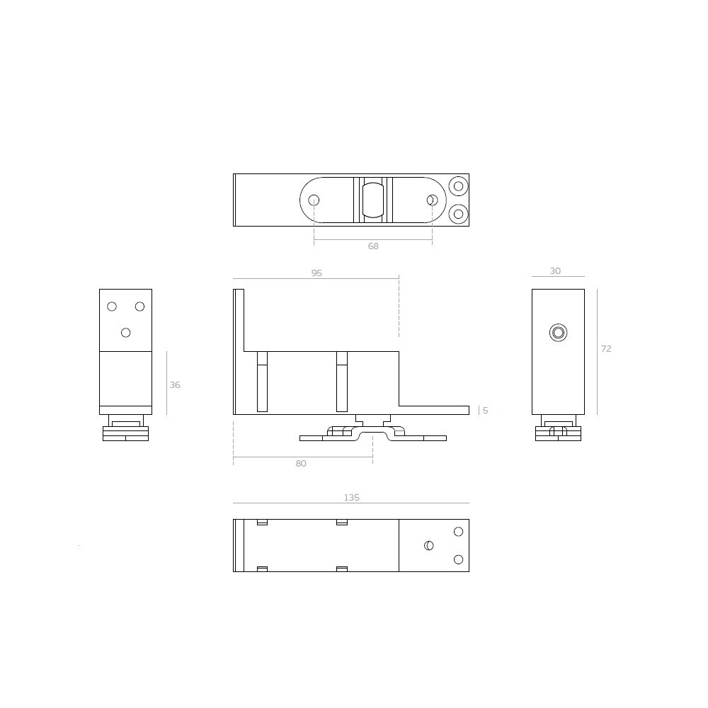 Dolny zawias ze sprężyną do drzwi typu pivot o maksymalnej wadze 45 kg. Wykonany z aluminium oraz ze stali nierdzewnej i dostępny w wykończeniu matowym. Posiada regulację siły zamykania za pomocą śruby.