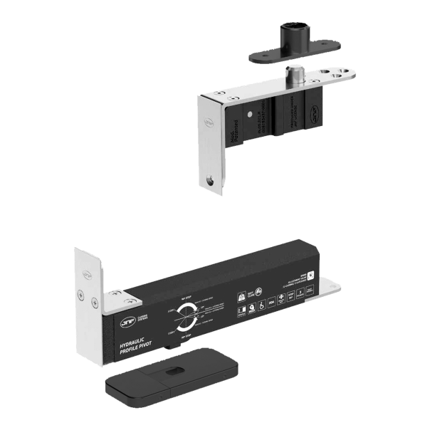 Zawias hydrauliczny do drzwi typu pivot składający się z części górnej oraz z części dolnej. Wykonany ze stali nierdzewnej oraz dedykowany do montażu w drzwiach profilowych o maksymalnej wadze 100 kg. Wyposażony w zawór do regulacji szybkości zamykania i siły domykania skrzydła, system Soft Close, a także funkcję przytrzymania otwarcia przy położeniu skrzydła 90°.