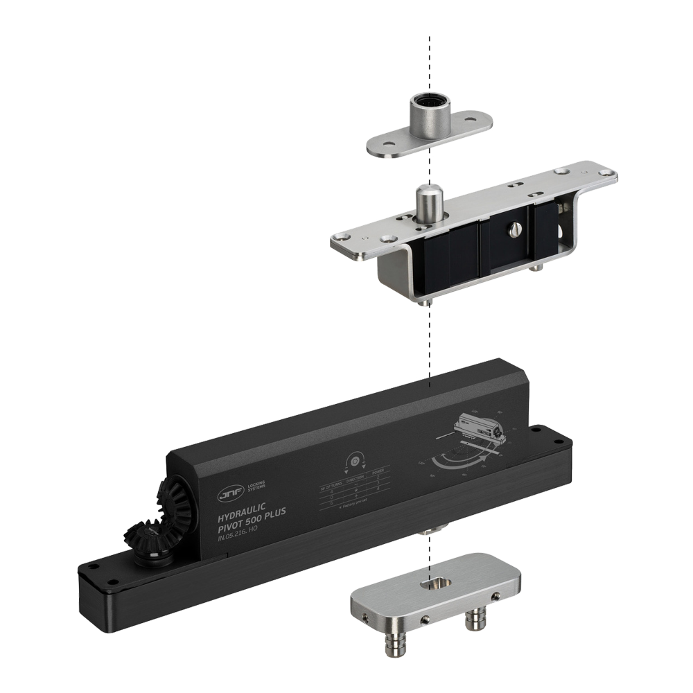 Zawias hydrauliczny do drewnianych drzwi typu pivot o wadze do 500 kg i minimalnej grubości skrzydła 50 mm. Został wykonany ze stali nierdzewnej i jest dostępny w wykończeniu w kolorze srebrnym. Istotną funkcjonalnością tego modelu zawiasu jest możliwość regulacji siły zamykania i domykania oraz tłumienia otwarcia (back check) w zakresie 80º-90º. Dodatkowo za pomocą specjalnej sprężyny można regulować główną siłę w zakresie 2-5. Zawias oferuje także funkcję przytrzymania otwarcia (Hold Open), gdy skrzydło znajduje się w położeniu 90º.