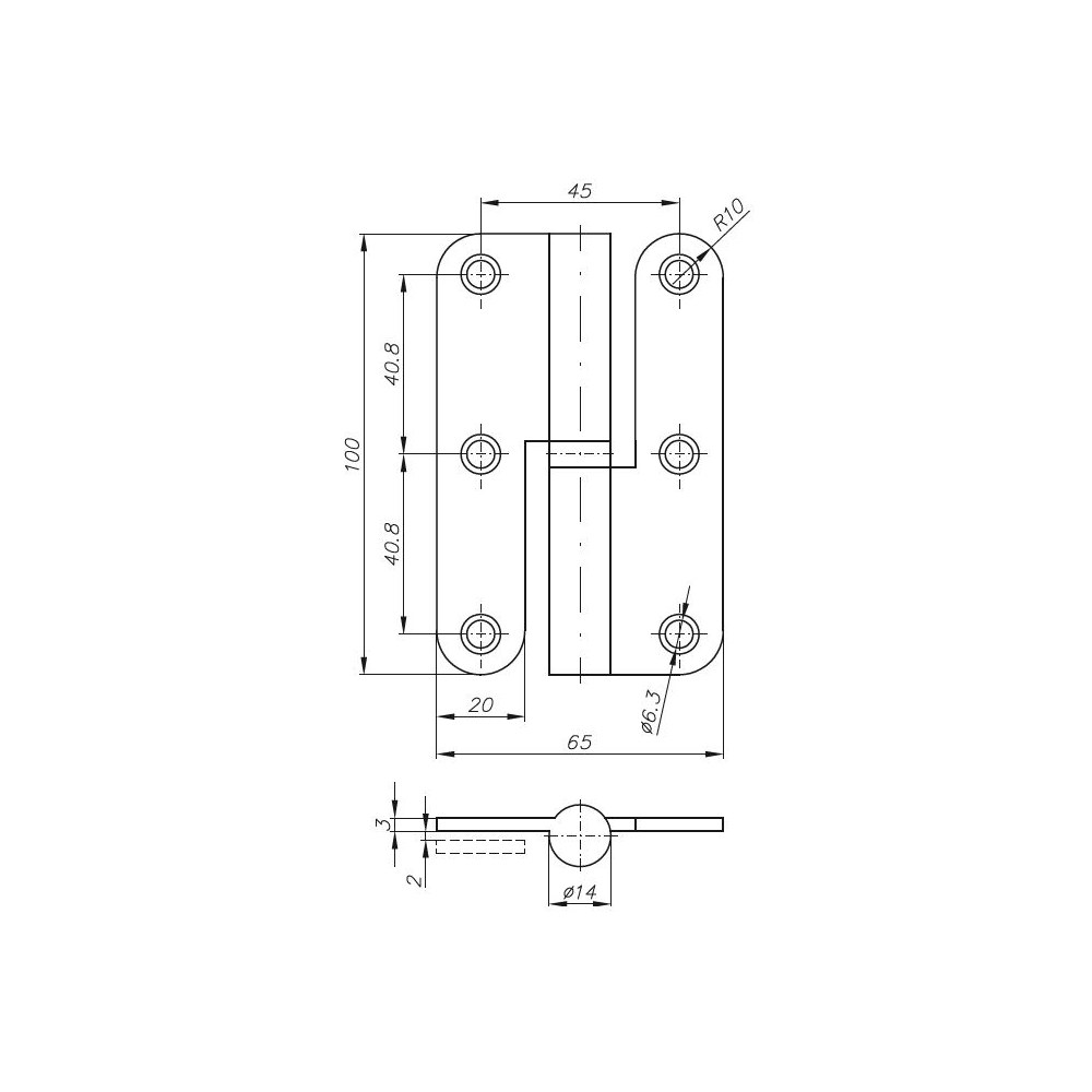 - Zawias przykręcany rozłączny o wymiarach 100x65 mm i średnicy 14 mm.