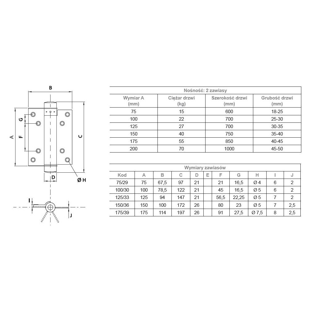 Jednokierunkowy zawias wykonany ze stali i dedykowany do zastosowania w wewnętrznych drzwiach wahadłowych. Wyposażony w sprężynę wymuszającą zamknięcie skrzydła drzwiowego.