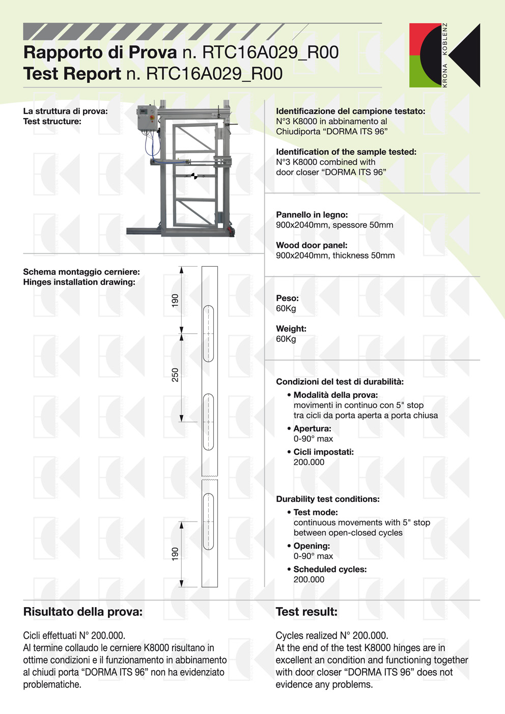 Model Atomika (K8000) został przetestowany na 200 000 cykli pracy. Jego właściwości potwierdza Deklaracja Właściwości Użytkowych oraz Raport z badań. Oba dokumenty zostały wystawione przez firmę Krona Koblenz, która jest producentem zawiasu.
